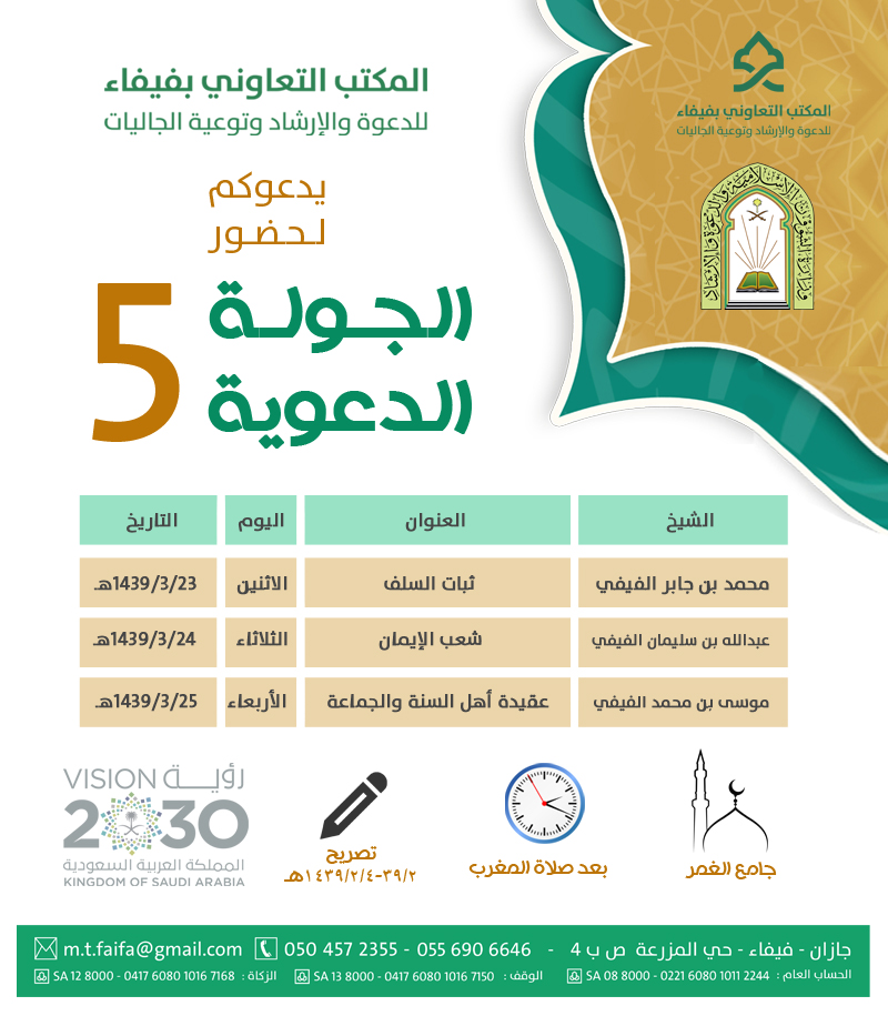 يعلن المكتب التعاوني للدعوة والإرشاد وتوعية الجاليات بمحافظة فيفاء عن إقامة الجولة الدعوية الرابعة والخامسة بجامع الغمر ومسجد التعاون (بالدثنة على خط الحزام ) بعد صلاة المغرب .يعلن المكتب التعاوني للدعوة والإرشاد وتوعية الجاليات بمحافظة فيفاء عن إقامة الجولة الدعوية الرابعة والخامسة بجامع الغمر ومسجد التعاون (بالدثنة على خط الحزام ) بعد صلاة المغرب .