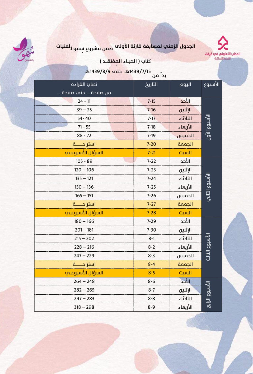 أطلقت اللجنة النسائية بالمكتب التعاوني للدعوة والإرشاد في فيفاء أمس الأحد 15-7-1439هـ مسابقة قارئة ضمن ( مشروع سُمــو للفتيات )