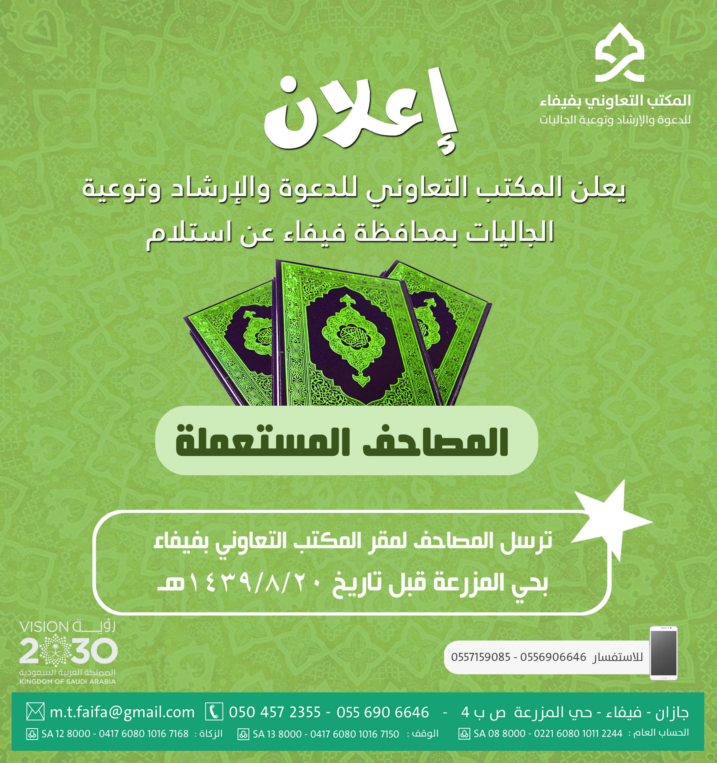 يعلن المكتب التعاوني للدعوة والإرشاد وتوعية الجاليات بمحافظة فيفاء عن استلامالمصاحف المستعملة