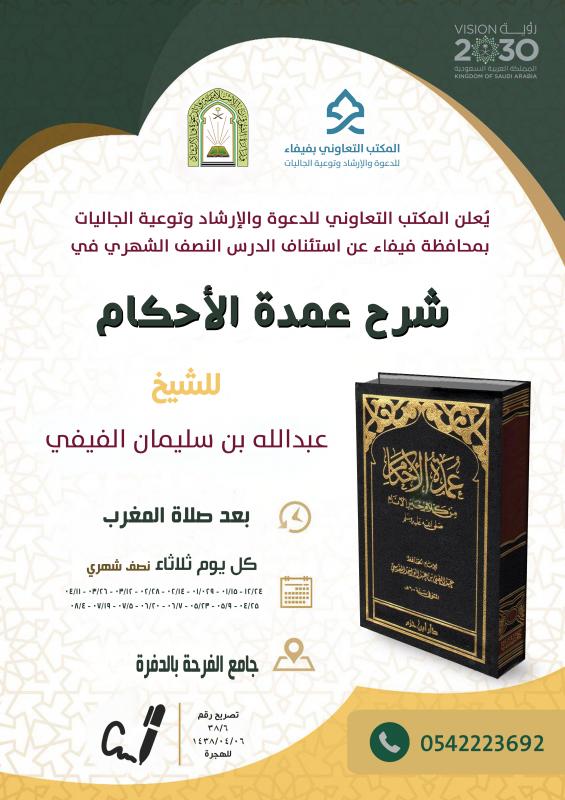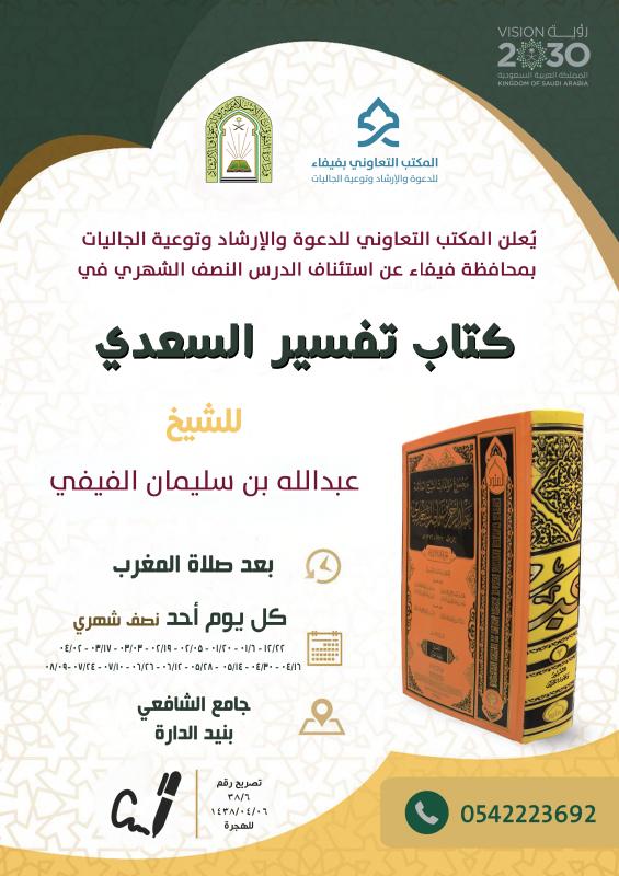 يعلن المكتب التعاوني للدعوة والإرشاد وتوعية الجاليات بمحافظة فيفاء عن استئناف الدرس النصف الشهري في كتاب تفسير السعدي وذلك بعد صلاة المغرب من كل يوم أحد بجامع الشافعي بنيد الدارة وكتاب شرح عمدة الأحكام بعد صلاة المغرب من كل يوم ثلاثاء بجامع الفرحة بالدفرة للشيخ / عبدالله بن سليمان الفيفي
