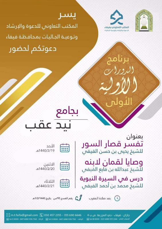 يعلن المكتب التعاوني للدعوة والإرشاد وتوعية الجاليات بمحافظة فيفاء عن انطلاق برنامج الدورات الدعوية للعام الحالي 1440هـ وذلك بجامع نيد عقب ولمدة ثلاثة أيام من بعد صلاة المغرب للشيخ يحيى بن حسن الفيفي بعنوان تفسير قصار السور ليوم الأحد والشيخ عبدالله بن فايع الفيفي بعنوان وصايا لقمان لابنه ليوم الاثنين والشيخ محمد بن أحمد الفيفي بعنوان درس في السيرة النبوية ليوم الثلاثاء