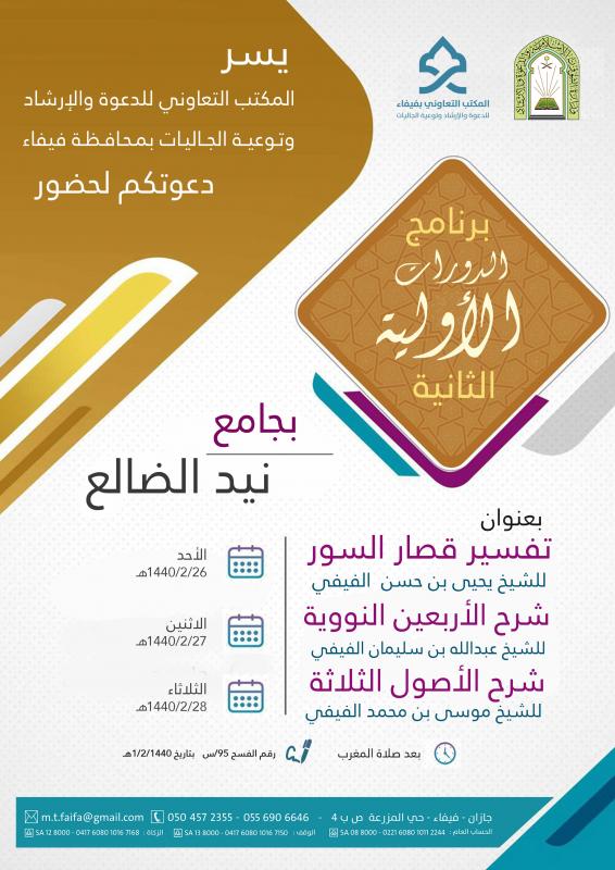 يعلن المكتب التعاوني للدعوة والإرشاد وتوعية الجاليات بمحافظة فيفاء عن برنامج الدورات الدعوية الثانية للعام الحالي 1440هـ وذلك بجامع نيد الضالع ولمدة ثلاثة أيام من بعد صلاة المغرب للشيخ يحيى بن حسن الفيفي بعنوان تفسير قصار السور ليوم الأحد والشيخ عبدالله بن سليمان الفيفي شرح الأربعين النووية ليوم الاثنين والشيخ موسى بن محمد الفيفي بعنوان شرح الأصول الثلاثة ليوم الثلاثاء