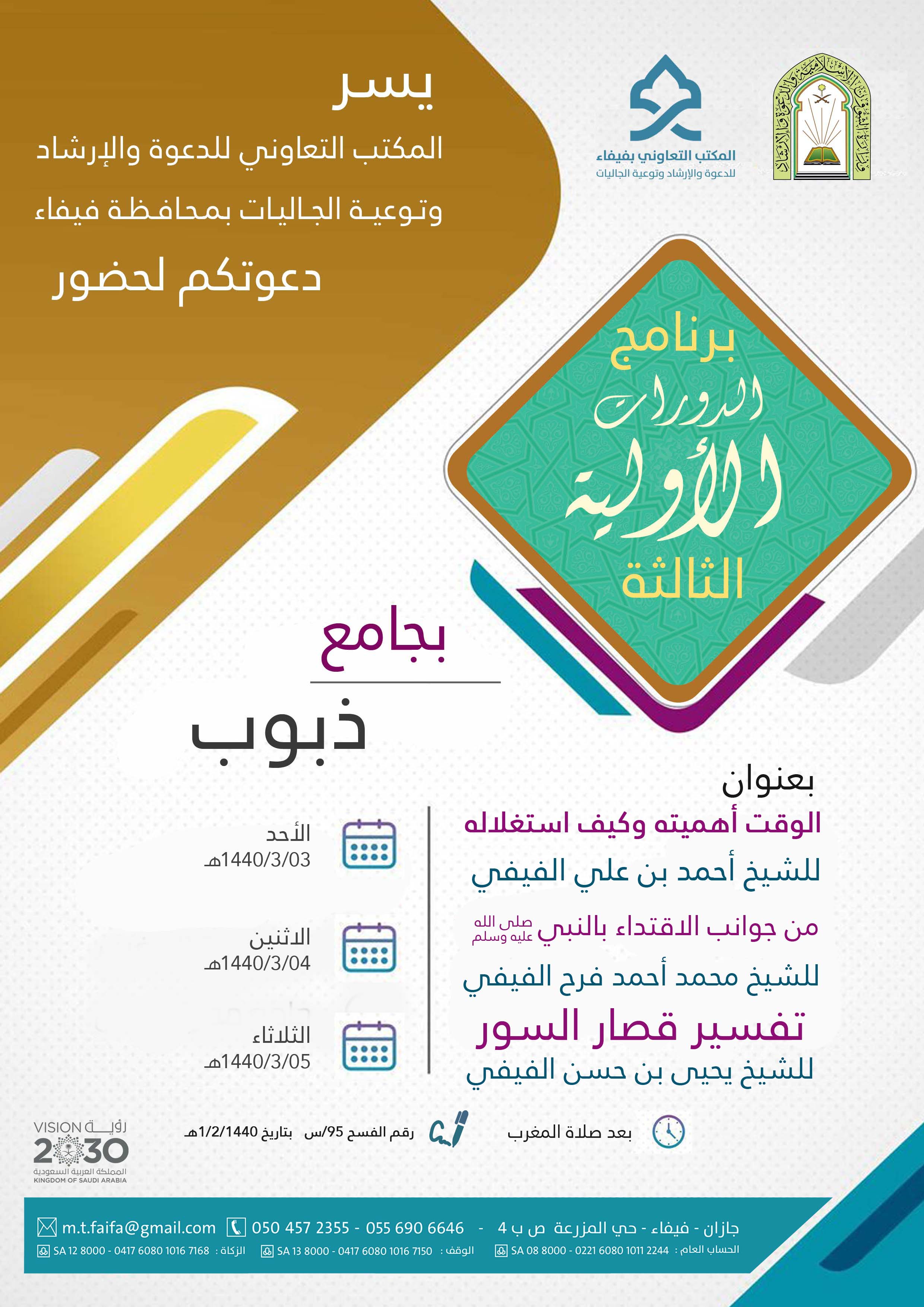 يعلن المكتب التعاوني للدعوة والإرشاد وتوعية الجاليات بمحافظة فيفاء عن برنامج الدورات الدعوية الثالثة للعام الحالي 1440هـ وذلك بجامع ذبوب ولمدة ثلاثة أيام من بعد صلاة المغرب يوم الأحد للشيخ أحمد بن علي الفيفي بعنوان الوقت أهميته وكيف استغلالهويم الاثنين للشيخ محمد بن أحمد فرح الفيفي بعنوان من جوانب الاقتداء بالنبي صلى الله عليه وسلم ويوم الثلاثاء للشيخ يحيى بن حسن الفيفي بعنوان تفسير قصار السور .