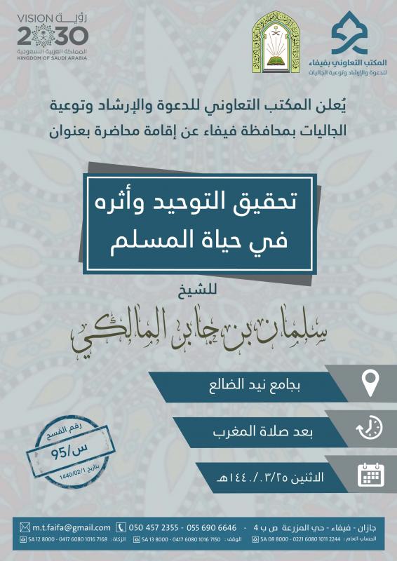 يعلن المكتب التعاوني للدعوة والإرشاد وتوعية الجاليات بمحافظة فيفاء عن إقامةمحاضرة للشيخ / سلمان بن جابر المالكي بعنوان تحقيق التوحيد وأثره في حياة المسلم وذلك بجامع نيد الضالع بعد صلاة المغرب الموافق 25/3/1440هـ .