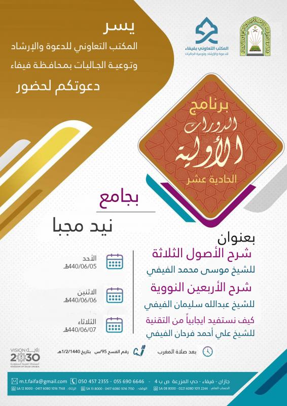 يعلن المكتب التعاوني للدعوة والإرشاد وتوعية الجاليات بمحافظة فيفاء عن برنامج الدورات الأولية الثانية عشر للعام الحالي 1440هـ وذلك بجامع نيد مجبا ولمدة ثلاثة أيام من بعد صلاة المغرب يوم الأحد للشيخ موسى بن محمد الفيفي بعنوان شرح الأصول الثلاثة ويوم الاثنين للشيخ عبدالله بن سليمان الفيفي بعنوان شرح الأربعين النووية ويوم الثلاثاء للشيخ على بن أحمد الفيفي بعنوان كيف نستفيد ايجابياً من التقنية .