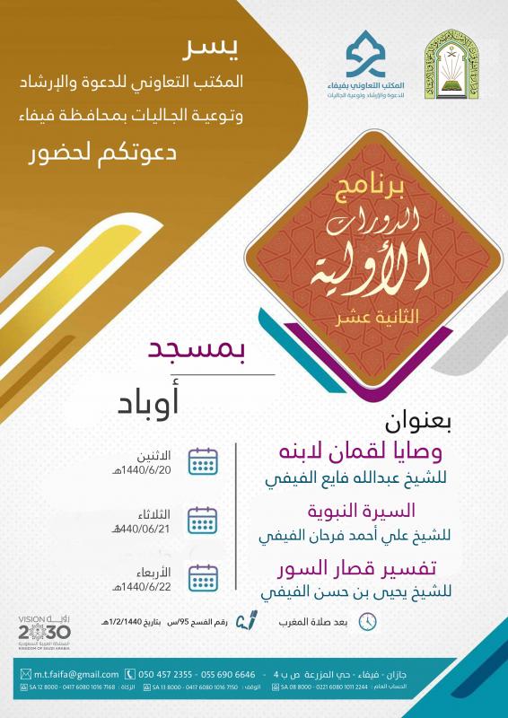 يعلن المكتب التعاوني للدعوة والإرشاد وتوعية الجاليات بمحافظة فيفاء عن برنامج الدورات الأولية الثانية عشر للعام الحالي 1440هـ وذلك بمسجد أوباد ولمدة ثلاثة أيام من بعد صلاة المغرب يوم الاثنين للشيخ عبدالله بن فايع الفيفي بعنوان وصايا لقمان لابنه ويوم الثلاثاء للشيخ على بن أحمد الفيفي بعنوان السيرة النبوية ويوم الأربعاء للشيخ يحيى بن حسن الفيفي بعنوان تفسير قصار السور .