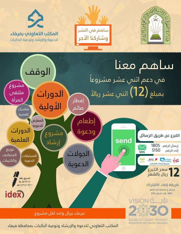ساهم معنا في دعم برامج المكتب ب 12 ريال شهرياً في حال اشتراكك تكون قد شاركت في أثنى عشر برنامجاً دعوياً
