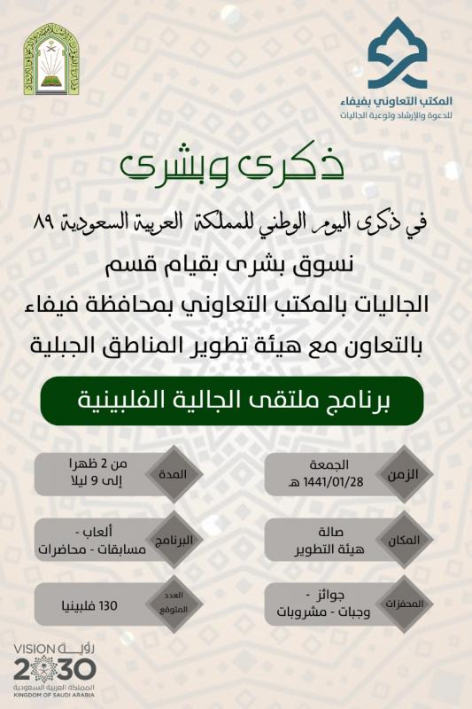يعلن قسم الجاليات بالمكتب التعاوني للدعوة والإرشاد وتوعية الجاليات بمحافظة فيفاء بالتعاون مع هيئة تطوير المناطق الجبلية عن
