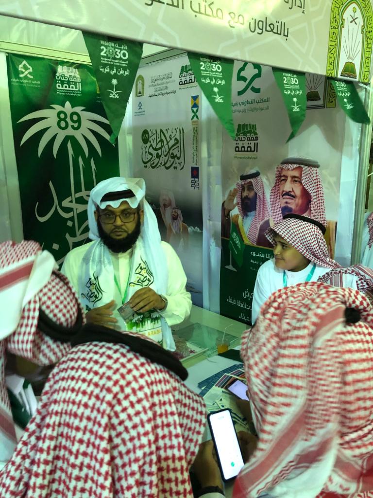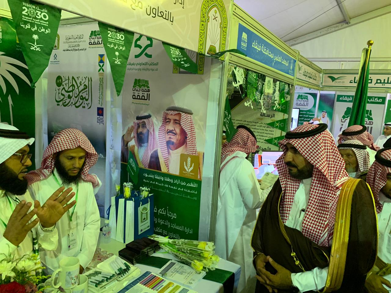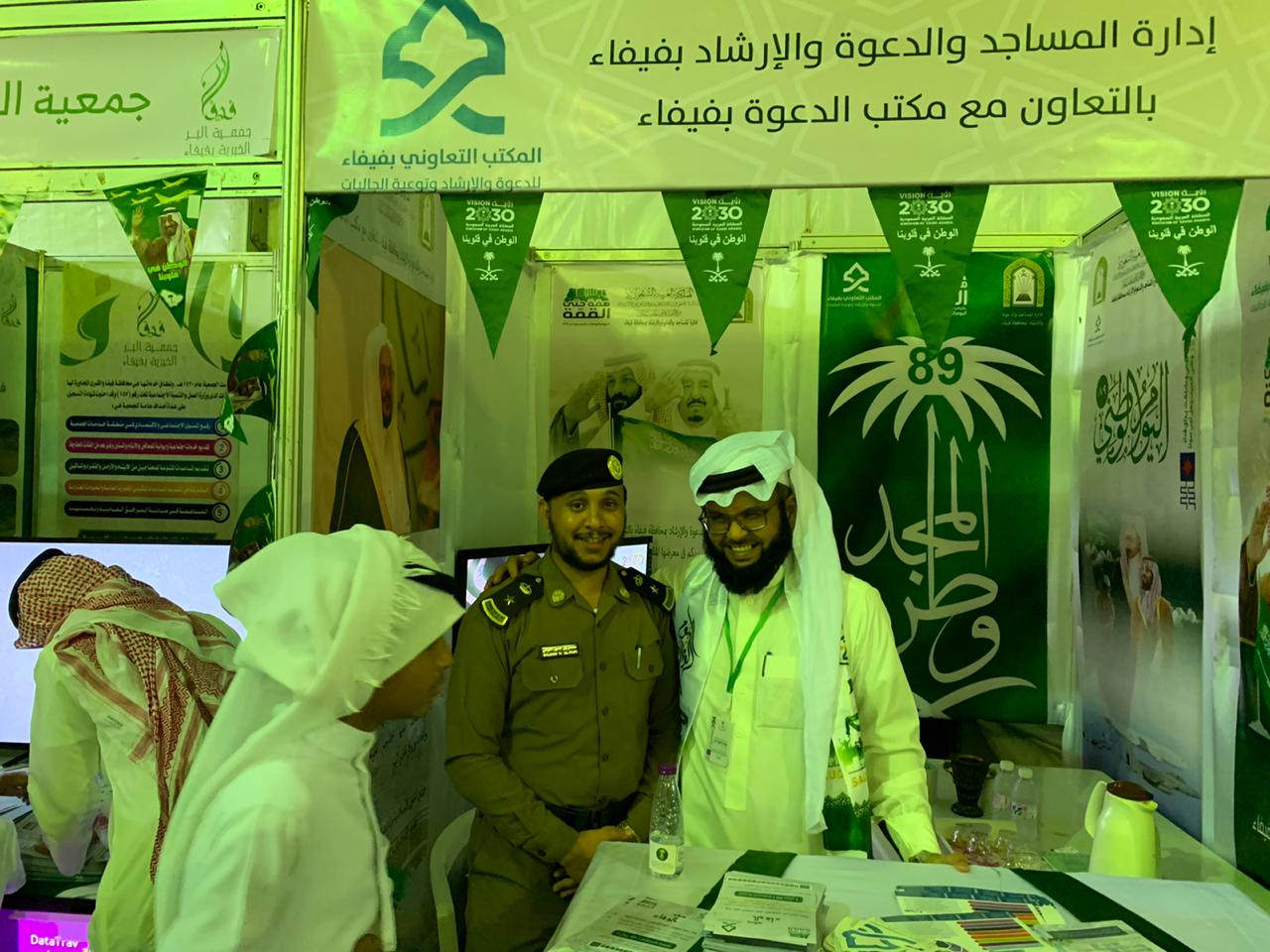 شاركت إدارة المساجد والدعوة والإرشاد بالتعاون مع مكتب الدعوة بفيفاء ضمن معرض حفل اليوم الوطني السعودي التاسع والثمانون لمحافظة فيفاء ببعض من العروض والمنشورات والتوزيعات التي زرعت البهجة على زوار المعرض وقد أثنى محافظ محافظة فيفاء سفر بن سعيد الشهراني على الجهود المبذولة من تلك الجهتين سائلين الله - العلي القدير - أن يديم الله على هذه البلاد أمنها واستقرارها تحت رعاية خادم الحرمين الشريفين، وولي عهده الأمين