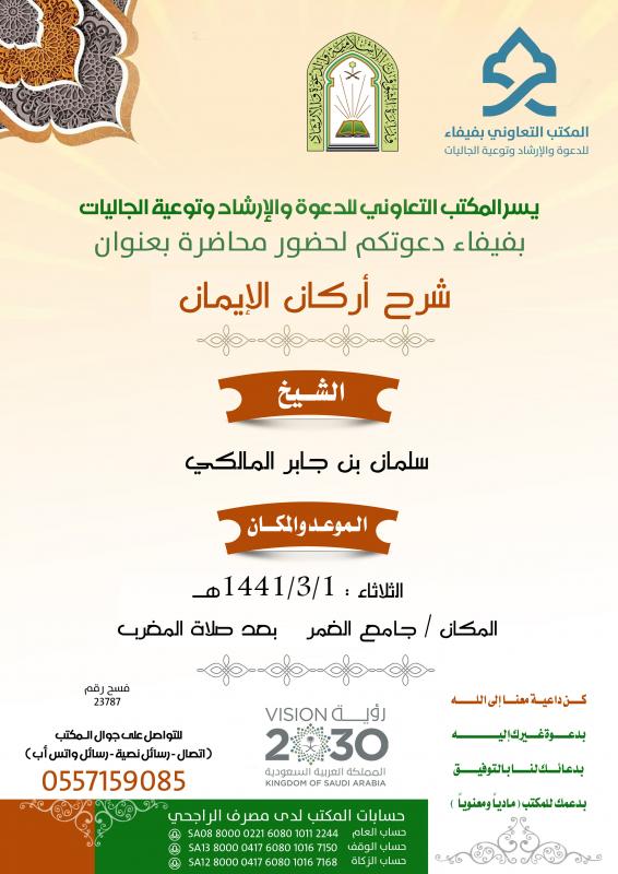 يعلن المكتب التعاوني للدعوة والإرشاد وتوعية الجاليات بمحافظة فيفاء عن إقامة محاضرة للشيخ / سلمان بن جابر المالكي بعنوان شرح أركان الإيمان وذلك بجامع الغمر بعد صلاة المغرب يوم الثلاثاء الموافق 1/3/1441هـ