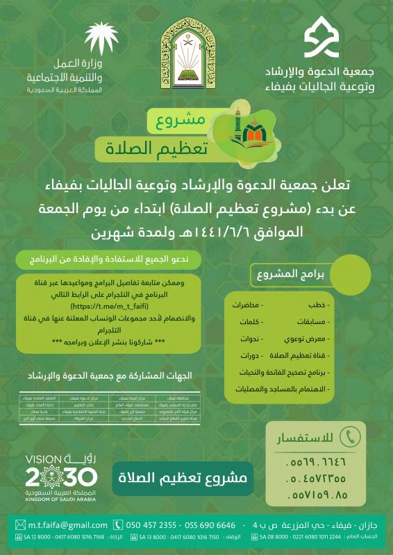 تعلن جمعية الدعوة والإرشاد وتوعية الجاليات بمحافظة فيفاء عن بدء مشروع تعظيم الصلاة ابتداءً من يوم الجمعة الموافق 6/6/1441هـ ولمدة شهرين يتخلل المشروع عدة برامج من محاضرات وكلمات وندوات ودورات ومسابقات ومعرض توعوي وقناة تعظيم الصلاة والاهتمام بالمساجد والمصليات وبرنامج تصحيح الفاتحة والتحيات