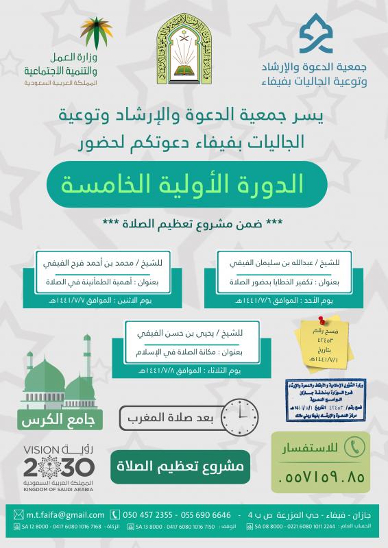 يسر جمعية الدعوة والإرشاد وتوعية الجاليات بمحافظة فيفاء عن دعوتكم لحضور برنامج الدورة الأولية الخامسة ضمن مشروع تعظيم الصلاة وذلك بجامع الكرس