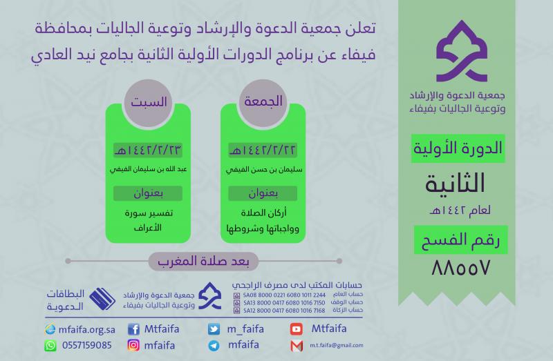 يسر جمعية الدعوة والإرشاد وتوعية الجاليات بمحافظة فيفاء دعوتكم لحضور برنامج الدورة الأولية الثانية وذلك بجامع نيد العادي