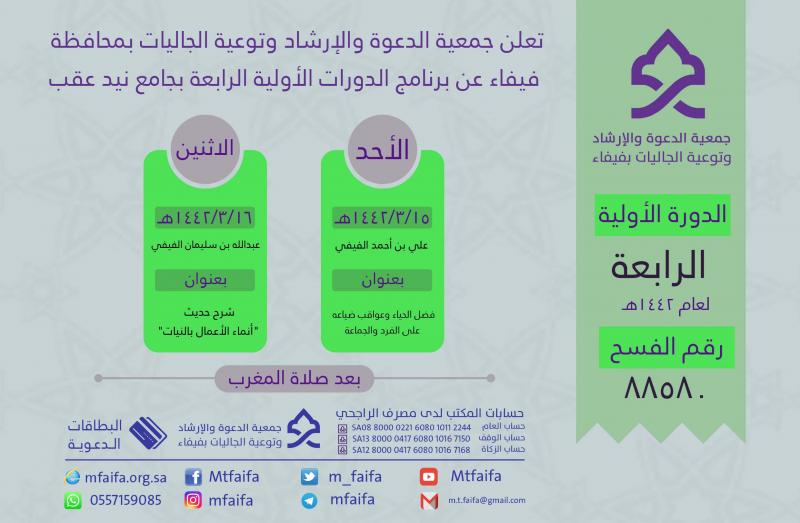 يسر جمعية الدعوة والإرشاد وتوعية الجاليات بمحافظة فيفاء دعوتكم لحضور برنامج الدورة الأولية الرابعة وذلك بجامع نيد عقب