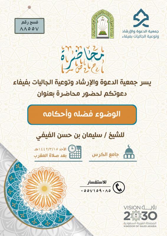 يسر جمعية الدعوة والإرشاد وتوعية الجاليات بمحافظة فيفاء دعوتكم لحضور محاضرة بعنوان