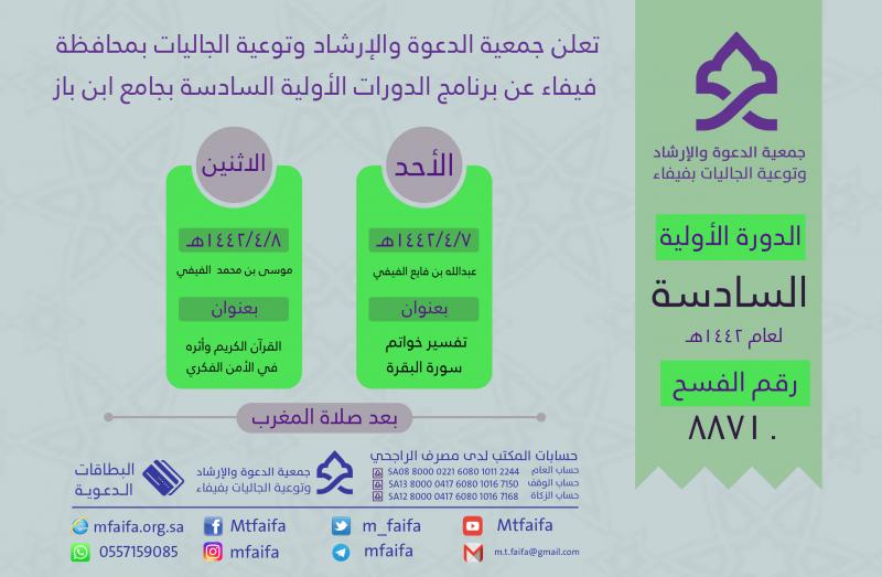 يسر جمعية الدعوة والإرشاد وتوعية الجاليات بمحافظة فيفاء دعوتكم لحضور برنامج الدورة الأولية السادسة وذلك بجامع ابن باز