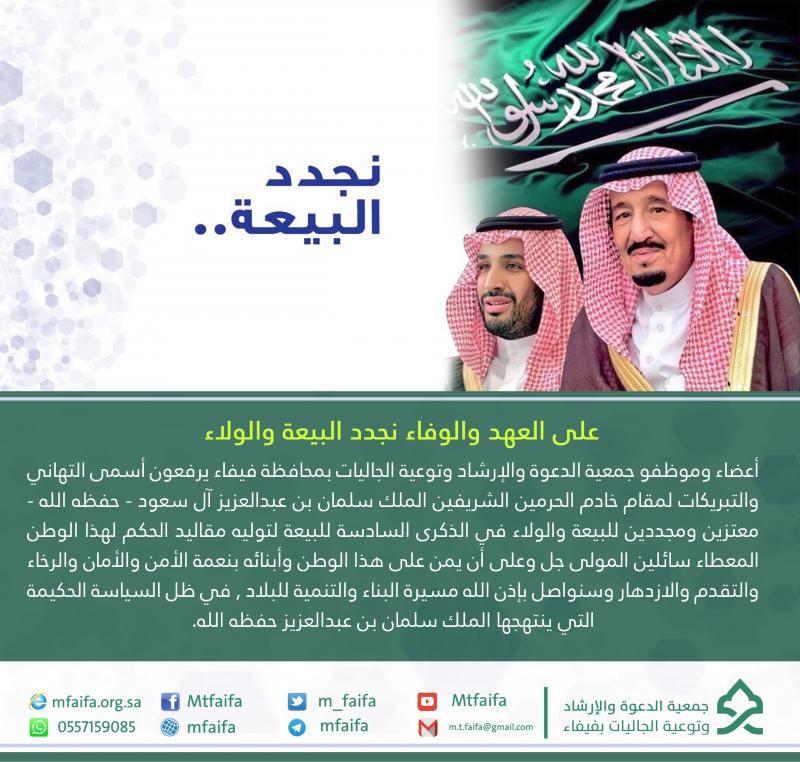 أعضاء وموظفو جمعية الدعوة والإرشاد وتوعية الجاليات بمحافظة فيفاء يرفعون أسمى التهاني والتبريكات لمقام خادم الحرمين الشريفين الملك سلمان بن عبدالعزيز آل سعود - حفظه الله - معتزين ومجددين للبيعة والولاء في الذكرى السادسة للبيعة لتوليه مقاليد الحكم لهذا الوطن المعطاء سائلين المولى جل وعلى أن يمن على هذا الوطن وأبنائه بنعمة الأمن والأمان والرخاء والتقدم والازدهار وسنواصل بإذن الله مسيرة البناء والتنمية للبلاد , في ظل السياسة الحكيمة التي ينتهجها الملك سلمان بن عبدالعزيز حفظه الله.