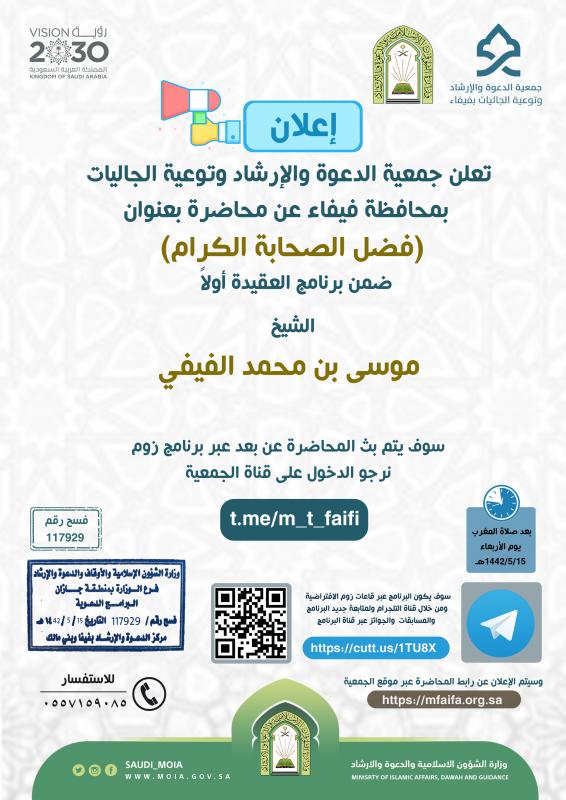 تعلن جمعية الدعوة والإرشاد وتوعية الجاليات بمحافظة فيفاء عن محاضرة بعنوانفضل الصحابة الكرام ضمن برنامج العقيدة أولاً للشيخ / موسى بن محمد الفيفي يوم الأربعاء 15/5/1442هـ وسوف يتم بث المحاضرة عن بعد عبر برنامج زوم نرجو الدخول على قناة الجمعية .