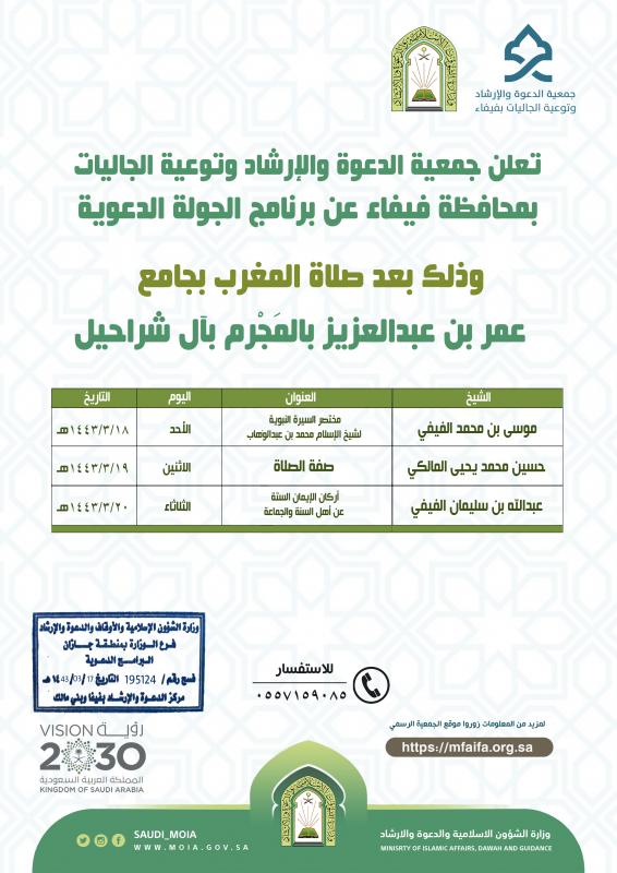 يسر جمعية الدعوة والإرشاد وتوعية الجاليات بمحافظة فيفاء لدعوتكم لحضور برنامج الجولة الدعوية وذلك بجامع عمر بن عبدالعزيز بالمَجْرِم بآل شراحيل