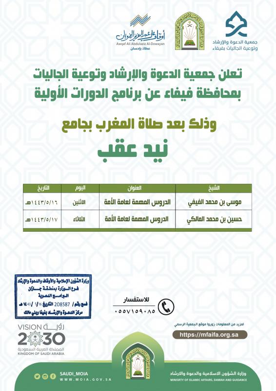 يسر جمعية الدعوة والإرشاد وتوعية الجاليات بمحافظة فيفاء دعوتكم لحضور برنامج الدورة الأولية الثانية وذلك بجامع نيد عقب بمحافظة فيفاء والمدعومة من أوقاف علي بن عبدالعزيز الضويان الخيرية والتي تبدأ من بعد صلاة المغرب مباشرةً وذلك حسب التفاصيل آدنا :