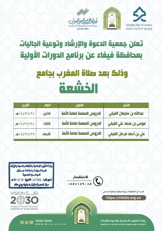 يسر جمعية الدعوة والإرشاد وتوعية الجاليات بمحافظة فيفاء دعوتكم لحضور برنامج الدورة الأولية التاسعة وذلك بجامع الخشعة بمحافظة فيفاء والمدعومة من أوقاف علي بن عبدالعزيز الضويان الخيرية والتي تبدأ من بعد صلاة المغرب مباشرةً وذلك حسب التفاصيل آدنا :