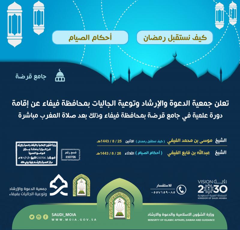 تعلن جمعية الدعوة والإرشاد وتوعية الجاليات بمحافظة فيفاء عن إقامة دورة علمية في جامع قرضة بمحافظة فيفاء وذلك بعد صلاة المغرب مباشرة حسب التفاصيل أدناه :