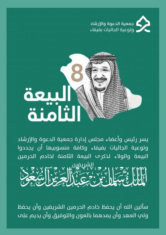يسر رئيس وأعضاء مجلس إدارة جمعية الدعوة والإرشاد وتوعية الجاليات بفيفاء وكافة منسوبيها أن يجددوا البيعة والولاء لذكرى البيعة الثامنة