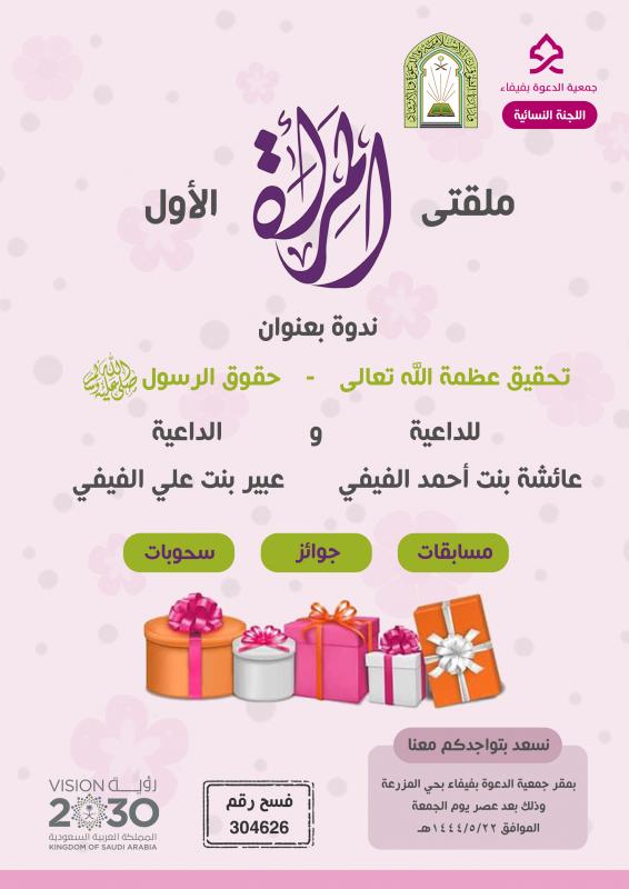 تسر اللجنة النسائية بجمعية الدعوة والإرشاد وتوعية الجاليات بفيفاء دعوتكن لحضور ملتقى المرأة الأول بعنوان