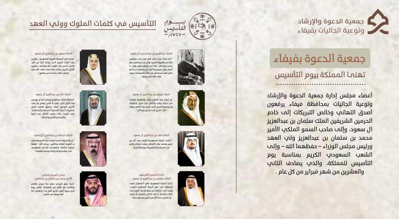 أعضاء مجلس إدارة جمعية الدعوة والإرشاد وتوعية الجاليات بمحافظة فيفاء يرفعون أصدق التهاني وخالص التبريكات إلى خادم الحرمين الشريفين الملك سلمان بن عبدالعزيز آل سعود، وإلى صاحب السمو الملكي الأمير محمد بن سلمان بن عبدالعزيز ولي العهد ورئيس مجلس الوزراء – حفظهما الله – وإلى الشعب السعودي الكريم بمناسبة يوم التأسيس للمملكة، والذي يصادف الثاني والعشرين من شهر فبراير من كل عام.