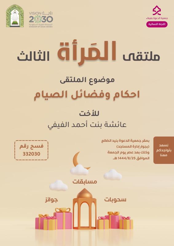 يسر القسم النسائي بجمعية الدعوة في فيفاء دعوتكم لحضور ملتقى المرأة الثالث بمقر الجمعية بنيد الضالع