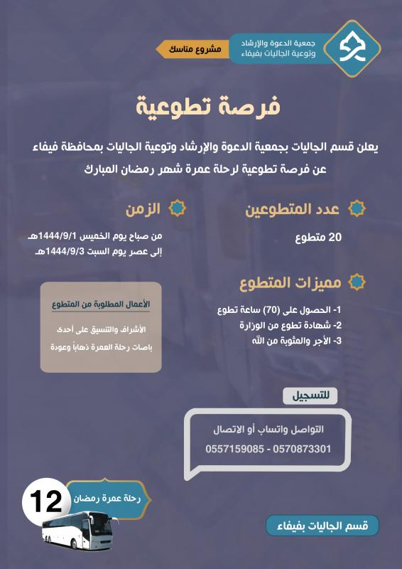 يعلن قسم الجاليات بجمعية الدعوة والإرشاد وتوعية الجاليات بمحافظة فيفاء عن فرصة تطوعية لرحلة عمرة شهر رمضان المبارك