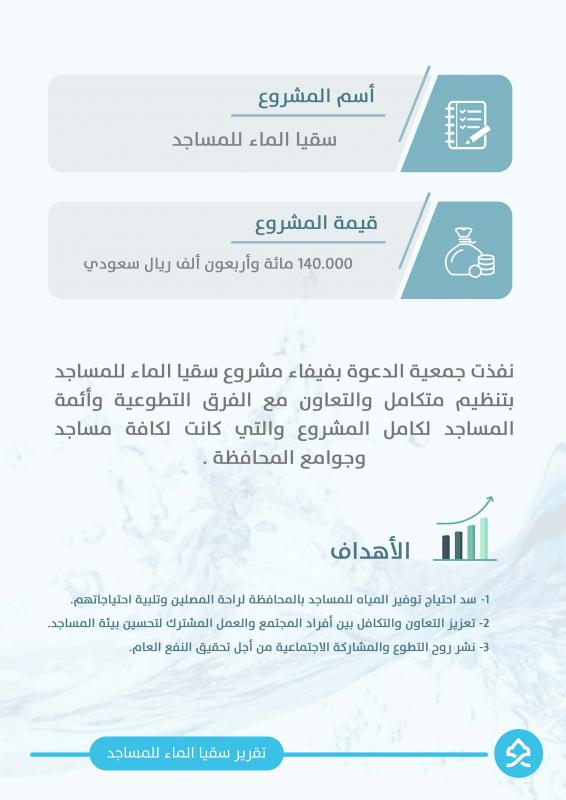 نفذت جمعية الدعوة بفيفاء مشروع سقيا الماء للمساجد بتنظيم متكامل والتعاون مع متطوع الجهة وأئمة المساجد لكامل المشروع والتي كانت لكافة مساجد وجوامع المحافظة .