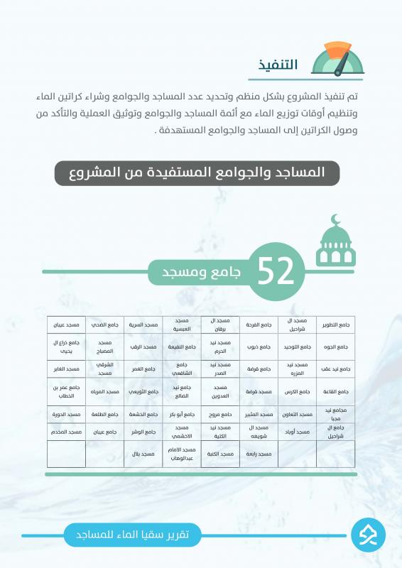 تم تنفيذ المشروع بشكل منظم وتحديد عدد المساجد والجوامع وشراء كراتين الماء وتنظيم أوقات توزيع الماء مع أئمة المساجد والجوامع وتوثيق العملية والتأكد من وصول الكراتين إلى المساجد والجوامع المستهدفة .