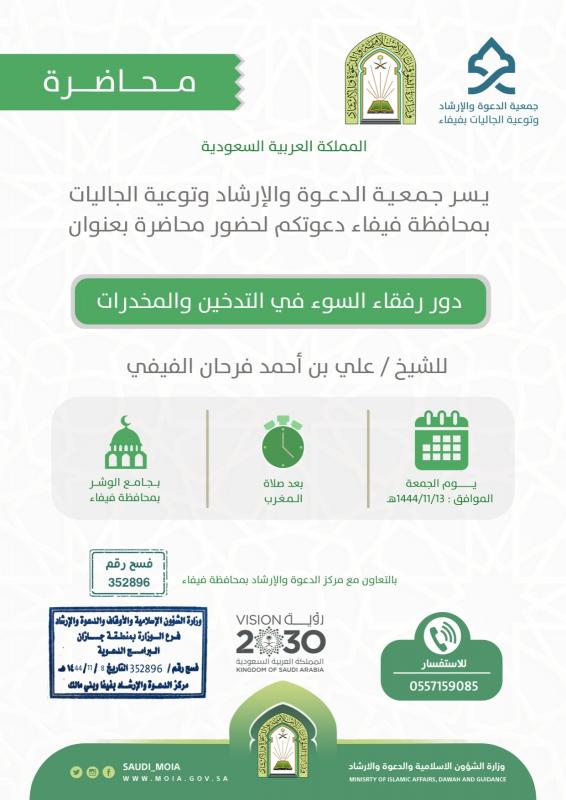 يسر جمعية الدعوة والإرشاد وتوعية الجاليات بمحافظة فيفاء دعوتكم لحضور محاضرة بعنوان