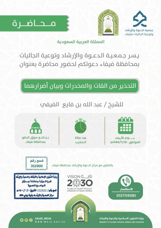 يسر جمعية الدعوة والإرشاد وتوعية الجاليات بمحافظة فيفاء دعوتكم لحضور محاضرة بعنوان
