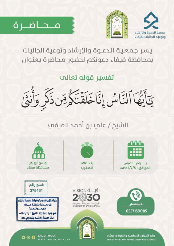 يسر جمعية الدعوة والإرشاد وتوعية الجاليات بمحافظة فيفاء دعوتكم لحضور محاضرة بعنوان