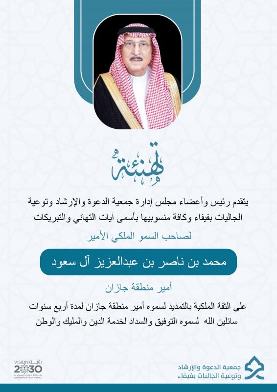 الجاليات بفيفاء وكافة منسوبيها بأسمى آيات التهاني والتبريكات