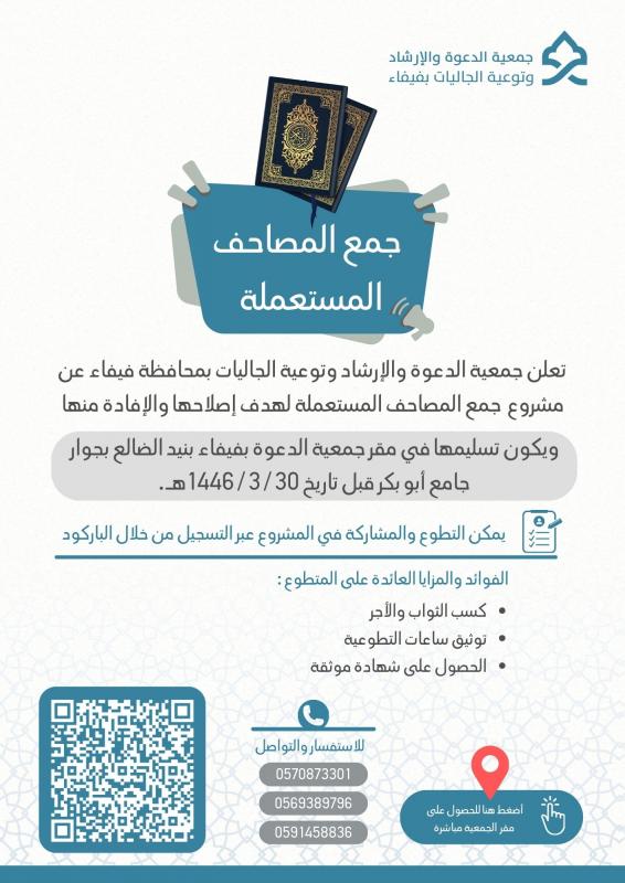 تعلن جمعية الدعوة والإرشاد وتوعية الجاليات بمحافظة فيفاء عن