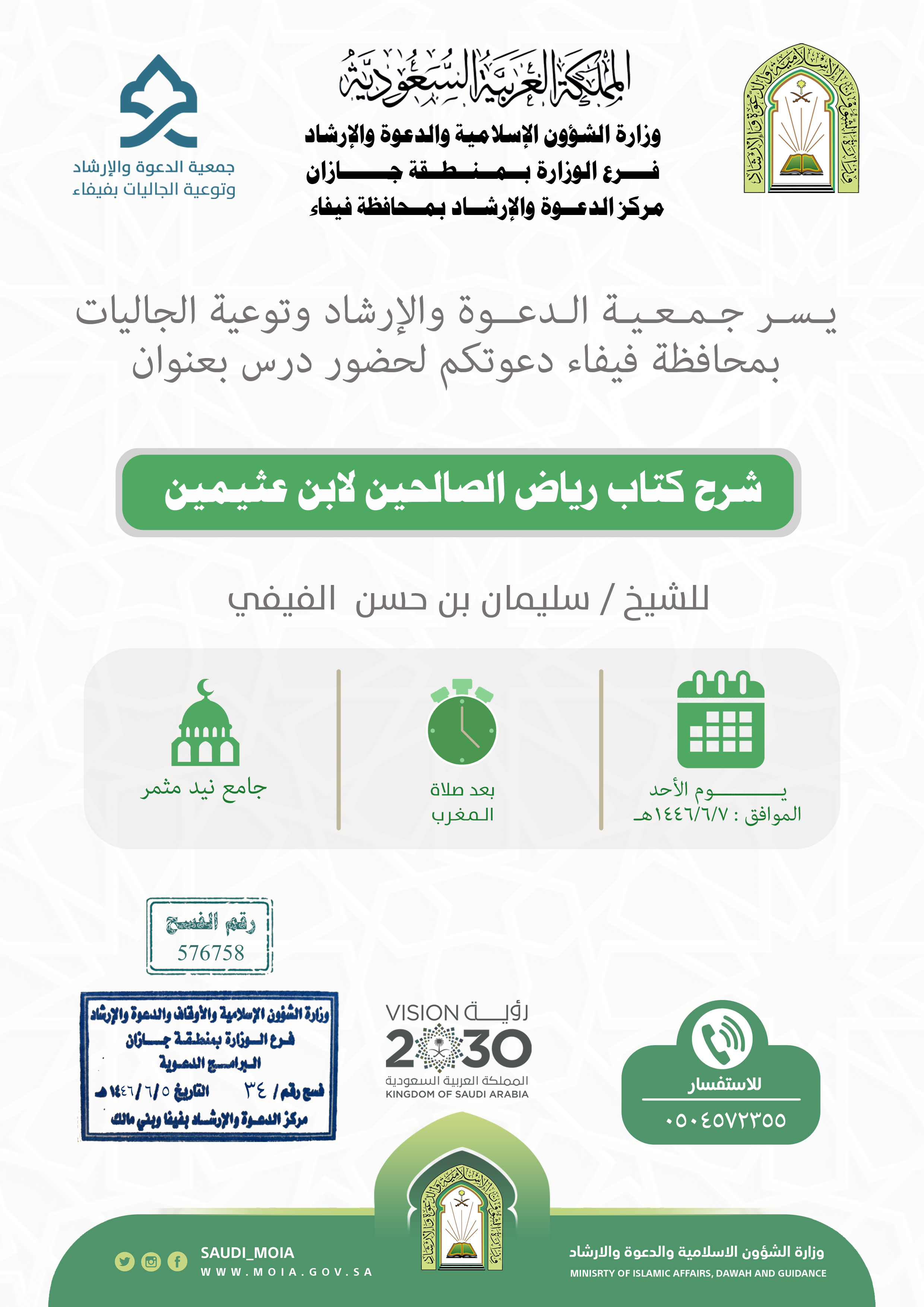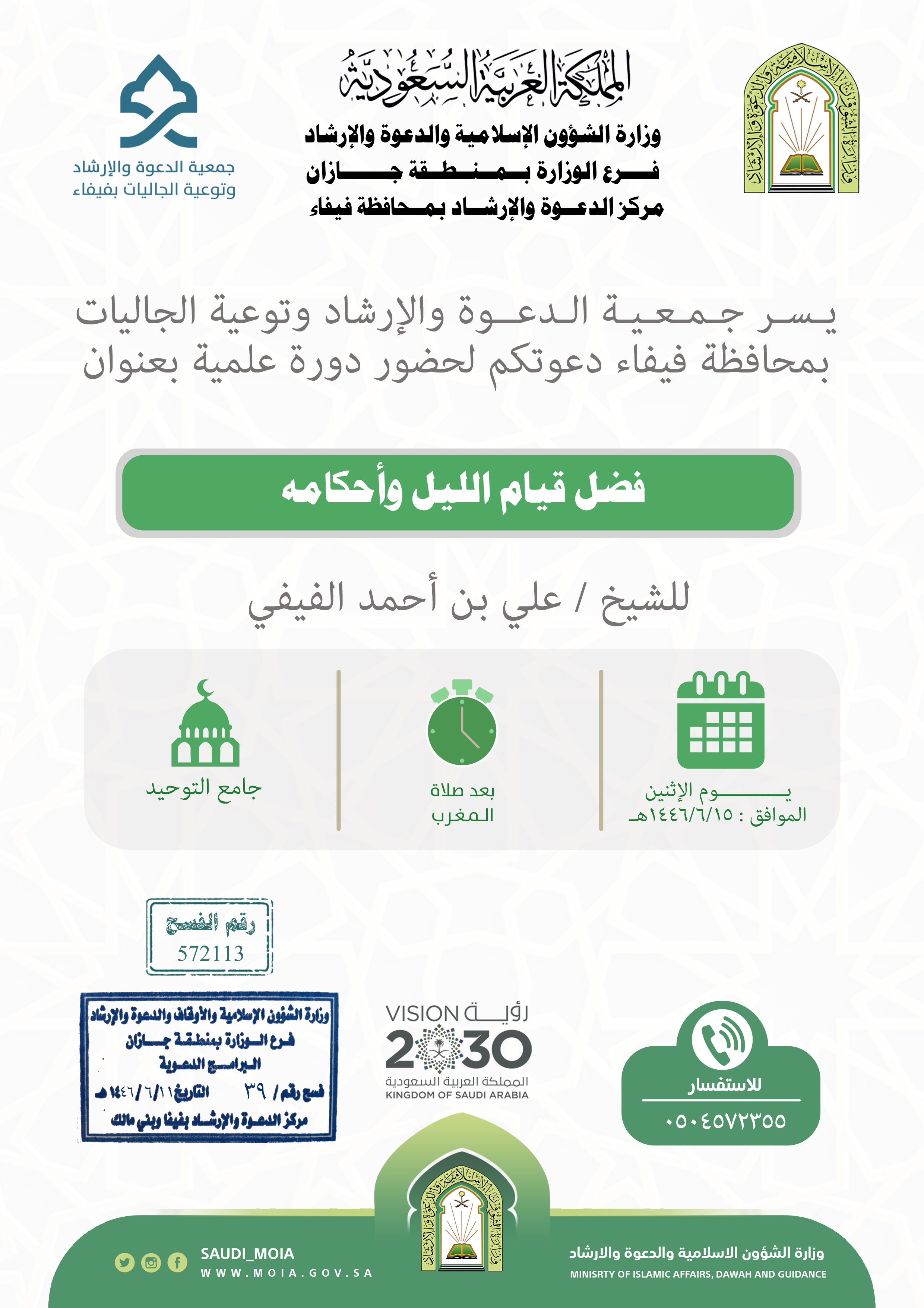 تعلن جمعية الدعوة والإرشاد وتوعية الجاليات بمحافظة فيفاء عن