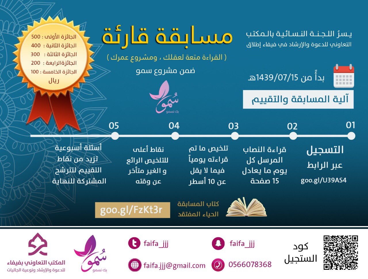 أطلقت اللجنة النسائية بالمكتب التعاوني للدعوة والإرشاد في فيفاء أمس الأحد 15-7-1439هـ مسابقة قارئة ضمن ( مشروع سُمــو للفتيات )