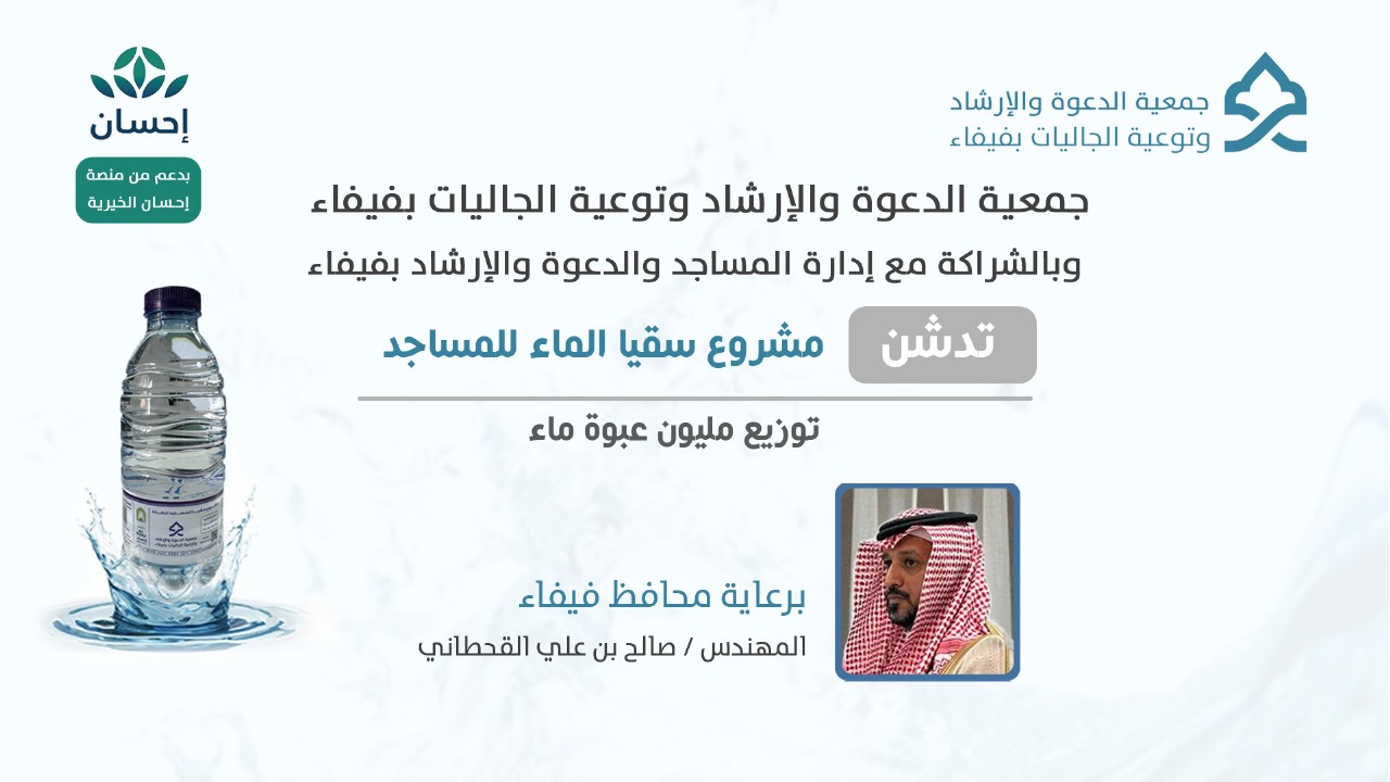 بحضور محافظ فيفاء تدشن جمعية الدعوة في فيفاء توزيع مليون عبوة ماء لجوامع ومساجد محافظة فيفاء والمحافظات المجاورة