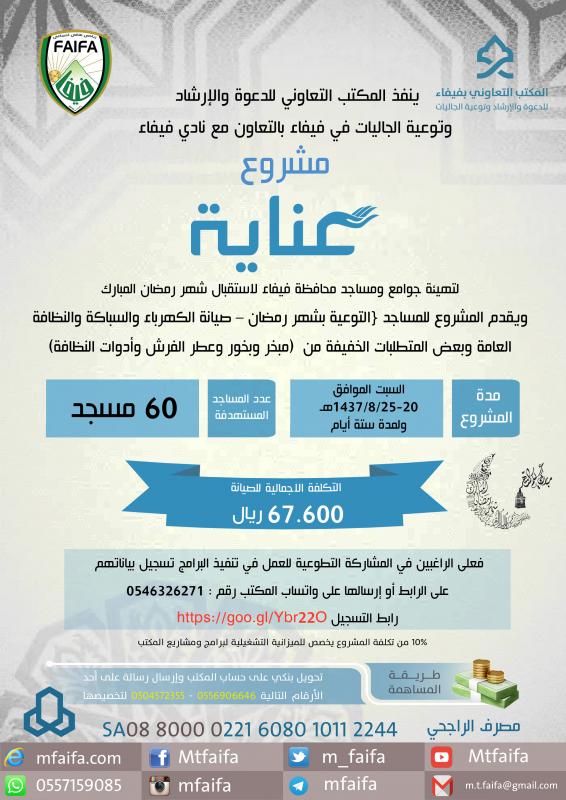 إعداد فريق تطوعي للعمل على تهيئة مساجد المحافظة لاستقبال شهر رمضان من خلال التوعية والعمل على الصيانة والنظافة للمساجد .