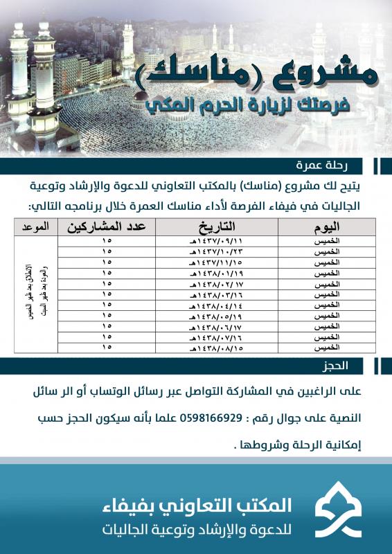 عبارة عن تنظيم زيارة لمكة المكرمة لأداء العمرة وتنفذ كل شهر .